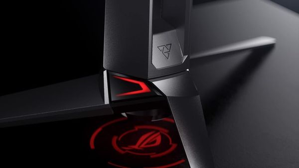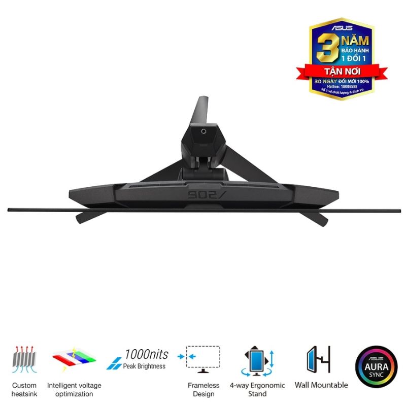 Đặt trên đế màn hình gồm 3 chân chắc chắn và đẹp mắt, không những thế ngay dưới chân đế sẽ phản chiếu hình ảnh của logo ROG theo phiên bản cyber gia tăng nên vẻ đẹp của không gian giải trí của game thủ chúng ta.