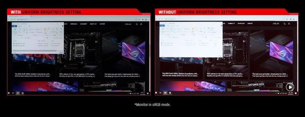 Cung cấp cho người dùng tính năng mang tên Uniform Brightness (đồng nhất độ sáng), Asus ROG Swift PG27AQDM sẽ tự động giảm độ sáng đến mức phù hợp trong những trường hợp như thay đổi kích thước thư mục có tông màu trắng lớn. Điều còn giúp cho đôi mắt trở nên thoải mái hơn khi sử dụng trong thời gian dài như chơi game hay làm việc.