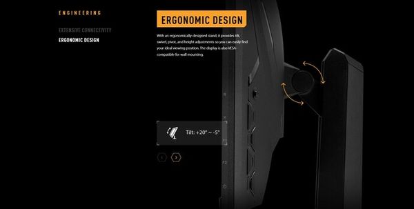 Với chân đế được thiết kế công thái học một trong những thiết kế nổi bật nhất hiện nay, cung cấp các điều chỉnh độ nghiêng, xoay, trục và chiều cao để bạn có thể dễ dàng tìm thấy vị trí xem lý tưởng của mình. Màn hình cũng tương thích với VESA để treo tường, tạo nên góc máy làm việc chơi game tối giản cùng với các thiết bị bàn phím và chuột từ kết nối có dây cho đến chuột không dây.