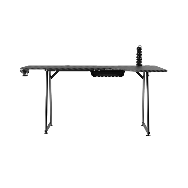 Với phần mặt bàn được làm bằng gỗ. Và phủ vân carbon cao cấp trang nhã. Ngoài ra, mặt bàn còn thiết kế sẵn phần đi dây điện để người dùng có thể kéo dây lên thiết bị một cách dễ dàng. Có sẵn móc treo tai nghe, hộc để cốc, móc treo gamepad và khoang giấu dây bên dưới