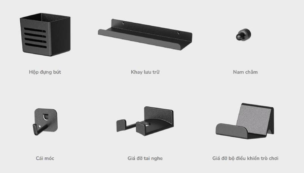 Bộ phụ kiện bao gồm: 1 giá đựng bút, 2 giá đựng tai nghe, 2 giá đựng tay cầm chơi game, 6 móc treo, 5 nam châm, 3 khay đựng.