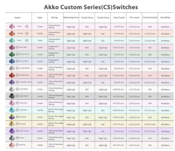 AKKO là hãng có những dòng Switches (công tắc cơ học) được làm riêng. Với đa dạng tính năng cũng như cảm giác gõ sẽ khác nhau với mỗi lựa chọn Switch. AKKO CS Switch là dòng Custom Series vốn chỉ được bán theo dạng Pack cho những bạn đam mê phím cơ CUSTOM dễ dàng thay thế.