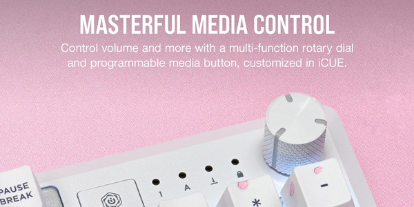 Bàn phím cơ Corsair K70 Core SE RGB Cherry Blossom CH-9109C1E-NA được trang bị các phím media control tiện lợi, giúp bạn dễ dàng điều chỉnh âm lượng, phát/dừng nhạc hay chuyển bài hát một cách nhanh chóng.