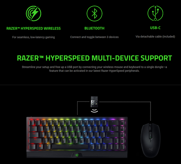 Razer BlackWidow V3 Mini HyperSpeed hỗ trợ 3 kiểu kết nối: USB-C, Bluetooth và không dây 2.4Ghz (thông qua Razer Dongle)