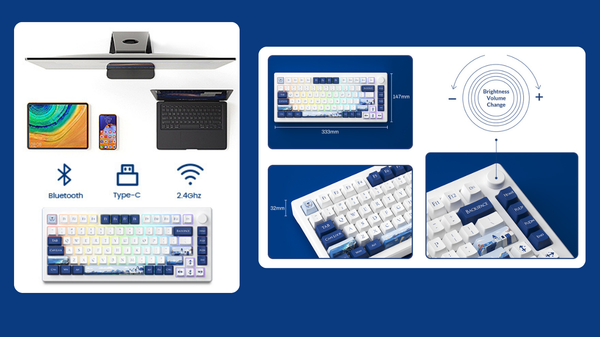 Bàn phím MOD 007B PC có thể kết nối với nhiều thiết bị thông qua Bluetooth 5.0, Wireless 2.4GHz, và chế độ có dây Type-C với khả năng chuyển đổi dễ dàng.