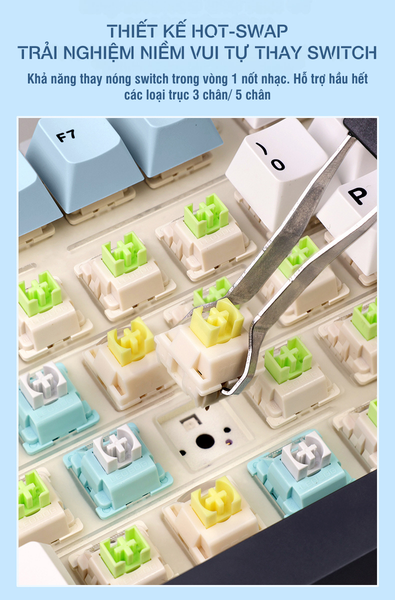 Hot-swappable trên bàn phím cơ AULA F75 Pro cho phép người dùng tự thay đổi hoặc nâng cấp các switch yêu thích trong một nốt nhạc. Tính năng tương thích với switch 3-pin và 5-pin.