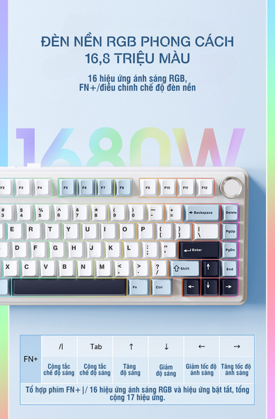 Bàn phím cơ Bàn phím cơ AULA F75 Pro được trang bị hệ thống đèn LED RGB 16.8 triệu màu cùng 16 hiệu ứng ánh sáng độc đáo. Sử dụng tổ hợp phím tắt FN+/ để điều chỉnh chế độ đèn nền.