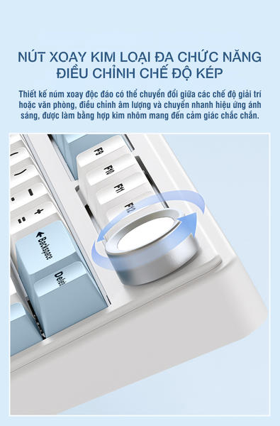 Một núm xoay Knob hợp kim nhôm được trang bị bên góc phải bàn phím, hỗ trợ chuyển đổi nhanh chóng giữa chế độ giải trí và văn phòng, điều chỉnh âm lượng, chuyển nhanh hiệu ứng ánh sáng.