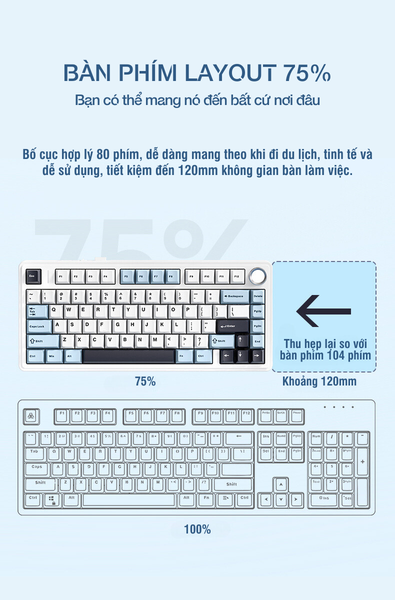 Với bố cục 75% gồm 80 phím, AULA Pro Gradient Black nhỏ gọn nhưng vẫn đảm bảo được trang bị đầy đủ các phím chức năng cần thiết để làm việc và chơi game, giúp tiết kiệm đến 120mm không gian trên bàn làm việc. Kích thước 322.7 × 143.2 × 43.1 mm và trọng lượng 975 gram, tiện lợi để mang theo bất cứ đâu. AULA F75 được chế tác từ những chất liệu cao cấp, mang lại cảm giác chắc chắn cùng độ bền cao.