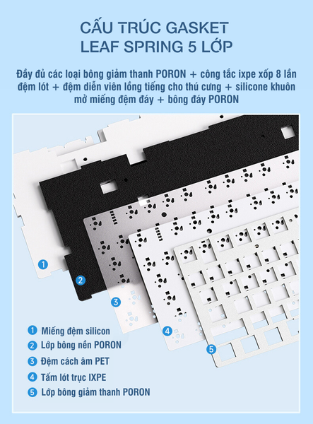 Bàn phím cơ AULA F75 Pro sử dụng cấu trúc đệm lò xo leaf spring 5 lớp, kết hợp các lớp giảm thanh và đệm silicon để tối ưu hóa khả năng phục hồi và ổn định. Thiết kế này giúp giảm thiểu tiếng ồn, mang lại cảm giác gõ phím thoải mái và êm ái hơn.