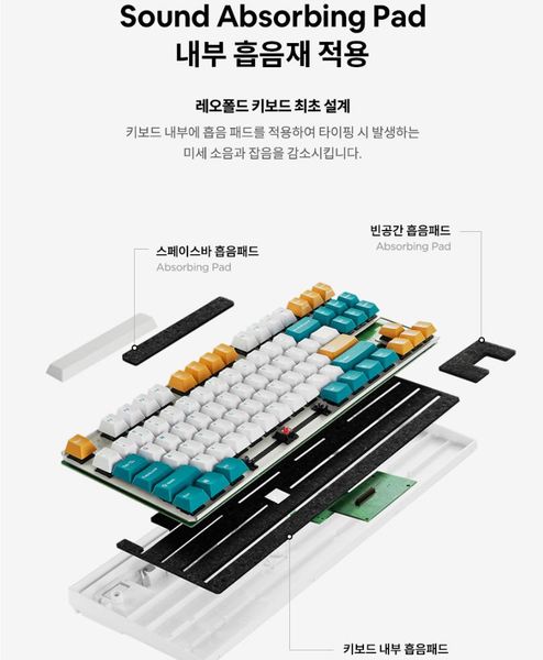 Các mẫu bàn phím Leopold luôn được trang bị lớp đệm tiêu âm nhằm hạn chế tiếng ồn phát ra khi sử dụng các mã phím của hãng. Với lớp foam tiêu âm này cũng sẽ 1 phần nào hạn chế các lỗi nghiêm trọng hơn khi khách hàng sử dụng lỡ làm đổ nước vào.
