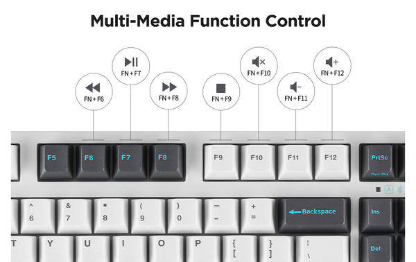 Bàn phím cơ không dây Leopold FC750RBT PD White Dark Grey tuy là phiên bản rút ngắn phần cụm phím số nhưng vẫn được trang bị đầy đủ các tổ hợp phím giúp người dùng dễ dàng tinh chỉnh âm lượng máy, chuyển bài nhạc,..Người dùng chỉ cần nhấn tổ hợp phím FN + các phím như bảng dưới