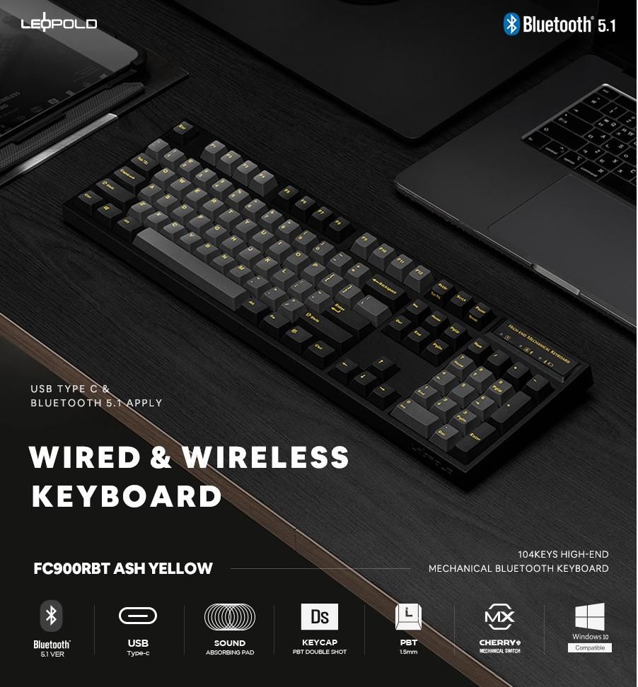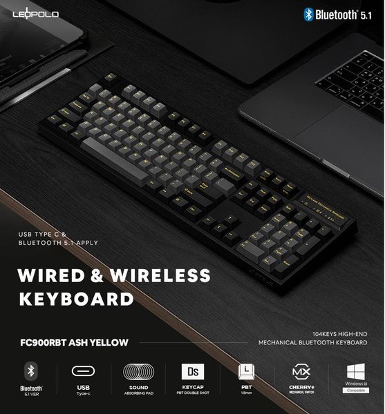 Bàn phím cơ không dây Leopold FC900RBT PD Ash Yellow là sản phẩm với nhiều đổi mới cũng như thay đổi của hãng. Ngoài việc hỗ trợ kết nối không dây thông qua chuẩn Bluetooth 5.1 (Leopold sử dụng chip Cypress CYW20730 mang lại độ bền cũng như tín hiệu không dây ổn định), dòng phím cơ mới về thị trường này còn thay đổi cổng kết nối sang USB Type C gọn đẹp và không sợ cắm sai đầu như chuẩn Micro USB trước đó