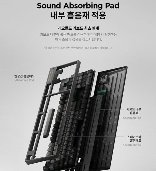 Các mẫu bàn phím Leopold luôn được trang bị lớp đệm tiêu âm nhằm hạn chế tiếng ồn phát ra khi sử dụng các mã phím của hãng. Với lớp foam tiêu âm này cũng sẽ 1 phần nào hạn chế các lỗi nghiêm trọng hơn khi khách hàng sử dụng lỡ làm đổ nước vào.
