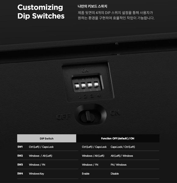 Nhằm tối ưu hóa trải nghiệm người dùng, bàn phím cơ cao cấp Leopold FC900RBT PD Ash Yellow được trang bị các công tắc DIP ở mặt sau phím nhằm thay đổi layout phím cho phù hợp với từng quốc gia. Công dụng của từng công tắc được liệt kê ở bảng dưới