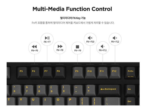Bàn phím cơ không dây Leopold FC900RBT PD Ash Yellow tuy là phiên bản rút ngắn phần cụm phím số nhưng vẫn được trang bị đầy đủ các tổ hợp phím giúp người dùng dễ dàng tinh chỉnh âm lượng máy, chuyển bài nhạc,..Người dùng chỉ cần nhấn tổ hợp phím FN + các phím như bảng dưới