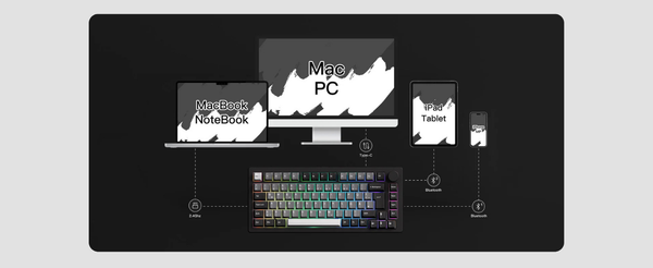 Bàn phím Monsgeek M1 V5 có thể kết nối với nhiều thiết bị thông qua Bluetooth 5.0, Wireless 2.4GHz, và chế độ có dây Type-C với khả năng chuyển đổi dễ dàng.