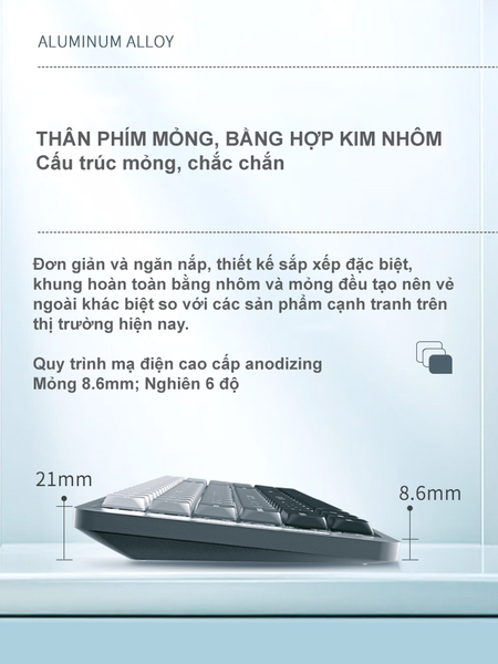 Khung mỏng bằng hợp kim nhôm Mỏng, chắc chắn, kết cấu tốt. Khung áp dụng kỹ thuật anodizing nhôm (quá trình điện hóa nhằm làm tăng độ dày lớp oxit hình thành tự nhiên trên bề mặt nhôm từ nanomet thành micronmet), Thiết kế cấu trúc nhẹ và mỏng, độ dày của bàn phím mỏng tới 8.6mm và thiết kế góc công thái học 6 độ giúp bàn phím trở nên tinh tế và độc đáo hơn