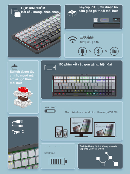 Hỗ trợ ba phương thức kết nối bluetooth, 2.4g, có dây. Bluetooth hỗ trợ kết nối 3 thiết bị cùng lúc, fn +1/2/3 có thể nhanh chóng chuyển đổi thiết bị để sử dụng Kết nối cùng lúc 5 thiết bị hoạt động chuyển đổi dễ đàng giữa 5 thiết bị.