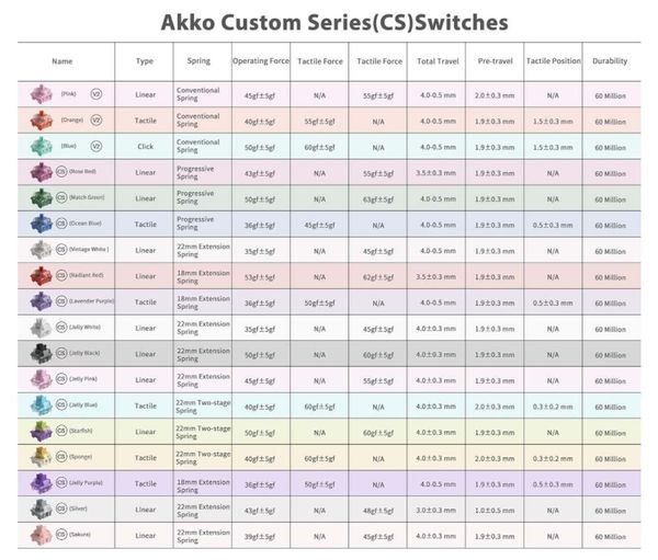 AKKO là hãng có những dòng Switches (công tắc cơ học) được làm riêng. Với đa dạng tính năng cũng như cảm giác gõ sẽ khác nhau với mỗi lựa chọn Switch. AKKO CS Switch là dòng Custom Series vốn chỉ được bán theo dạng Pack cho những bạn đam mê phím cơ CUSTOM dễ dàng thay thế.