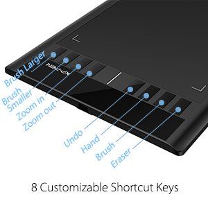 8 nút bấm có thể thiết lập mọi thao tác phím tắt giúp tối thiểu nhu cầu dùng bàn phím ngoài, hỗ trợ các tính năng chỉnh sửa bạn hay xài và các tổ hợp phím khác như Ctrl+S (Save), Ctrl+X (Undo),...Ngay từ đầu, XP-Pen Star 03 đã được thiết lập các tính năng mặc định: Brush enhance/weaken, zoom-in/out, Undo, hand tool, brush tool, erase, tuy nhiên bạn có thể vào driver của máy để chỉnh lại. Hỗ trợ cả phím tắt như khi cần mở nhanh một chương trình hay website nào đó.