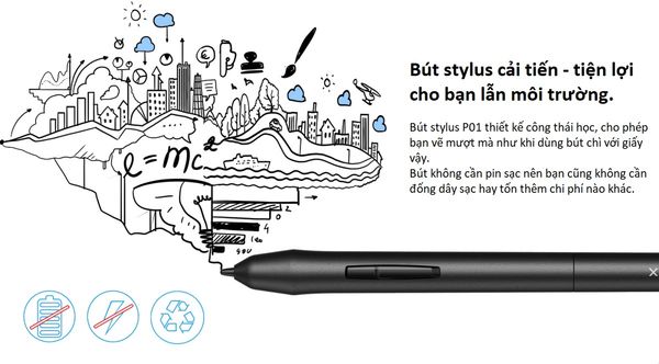 Stylus P01 được thiết kế công thái học (ergonomi) cho cảm giác vẽ mượt mà như khi dùng với giấy và bút chì. Bút không cần sạc hay dùng pin giúp tiết kiệm chi phí, tiện lợi, lại bảo vệ môi trường. Nút bấm trên thân bút cho phép chuyển đổi chế độ Brush và Eraser nhanh chóng, giúp quá trình sáng tác hiệu quả hơn.
