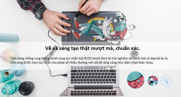 Tính năng chống rung thông minh cùng lực nhấn bút 8192 levels đem lại trải nghiệm vẽ thoải mái và dẹp bỏ âu lo. Cảm ứng 8192 mức lực nhấn cho phép vẽ nhiều đường nét với bề rộng cũng như đậm nhạt khác nhau, phù hợp với tay trái lẫn tay phải.
