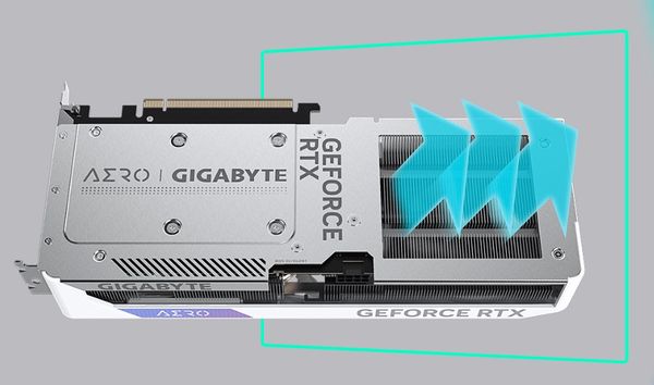Với hệ thống làm mát WINDFORCE có ba quạt cánh quạt 80mm độc đáo, quay xen kẽ với 4 ống dẫn nhiệt bằng đồng tổng hợp tiếp xúc trực tiếp với GPU, VGA Gigabyte RTX 4060 Ti Aero OC 8GB mang lại hiệu quả tản nhiệt vượt trội.