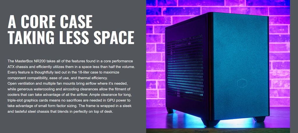 MasterBox NR200 đem tới đầy đủ các tính năng, khả năng làm mát tương tự các mẫu vỏ case kích thước ATX thông thường. Mẫu vỏ case tận dụng tối đa không gian bên trong cho dù thể tích chỉ 18 lít, vừa vặn cho các linh kiện cấu hình cao cũng như đem tới khả năng làm mát tối đa.
