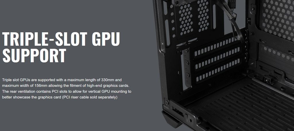 Hỗ trợ card đồ họa 3 slot. Sẵn sàng để có lắp đặt kèm các card đồ họa cao cấp có chiều dài tới 330mm, rộng 156mm. Khe xoay dọc sẵn sàng giúp bạn khoe trọn vẻ đẹp của card đồ họa.