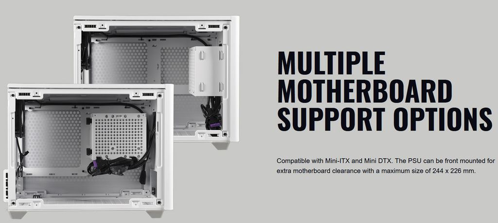 Hỗ trợ nhiều loại mainboard Mini ITX và Mini DTX. Kích thước tối đa 244 x 226 mm