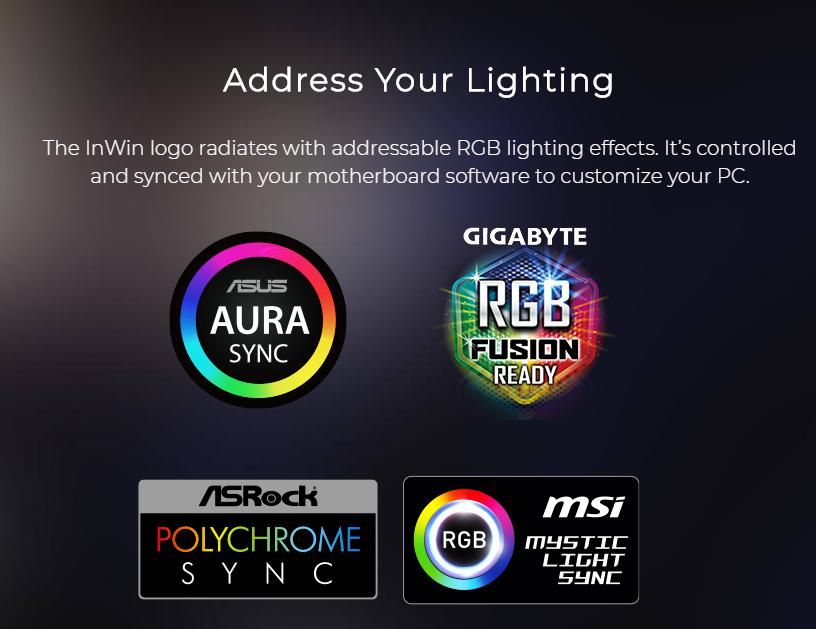 Logo InWin tỏa sáng với các hiệu ứng RGB được điều khiển và đồng bộ hóa với tất cả phần mềm hiện nay của hãng