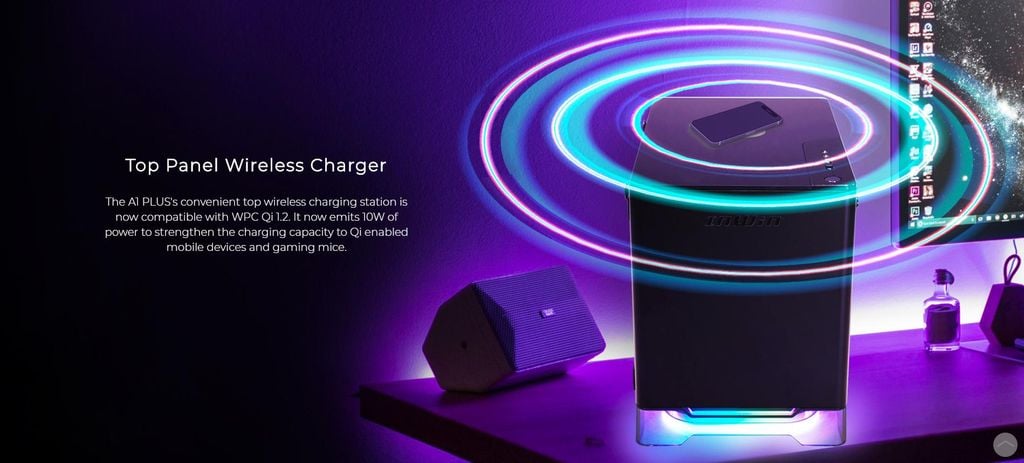 INWIN A1 PLUS có phần nóc trang bị sạc không dây. Tiêu chuẩn WPC Qi1.2 cung cấp dòng sạc lên tới 10W sẵn sàng cung cấp điện cho smartphone của bạn.