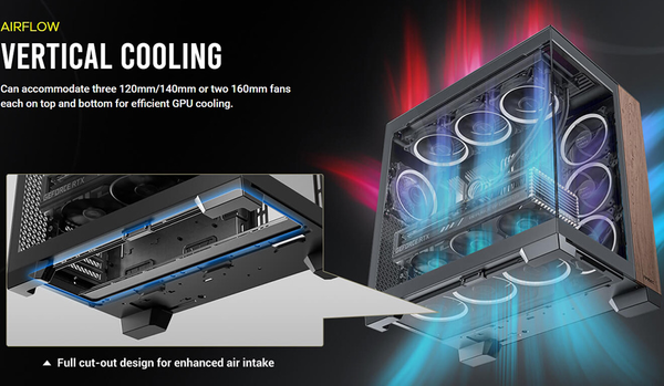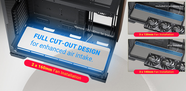 Có thể chứa ba quạt 120mm/140mm hoặc hai quạt 160mm ở trên và dưới để làm mát GPU hiệu quả.