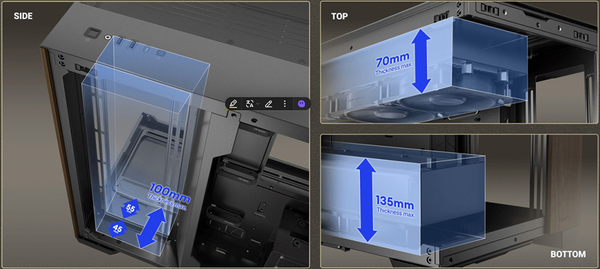 Mặt trên, mặt dưới và bên phải đều hỗ trợ bộ tản nhiệt DÀY 360mm, mang lại khả năng và hiệu quả làm mát cực cao.