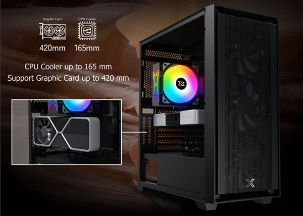 Case Xigmatek Anubis Pro 4FX hỗ trợ độ cao cho tản nhiệt khí CPU là 165mm và độ cao dành cho card đồ họa VGA lên tới 420mm, cùng với việc tương thích với bộ tản nhiệt nước 120/240/360mm. Sự kết hợp này tạo ra một không gian rộng rãi và thoáng đãng, giúp tối ưu hiệu suất làm mát cho máy tính của bạn.