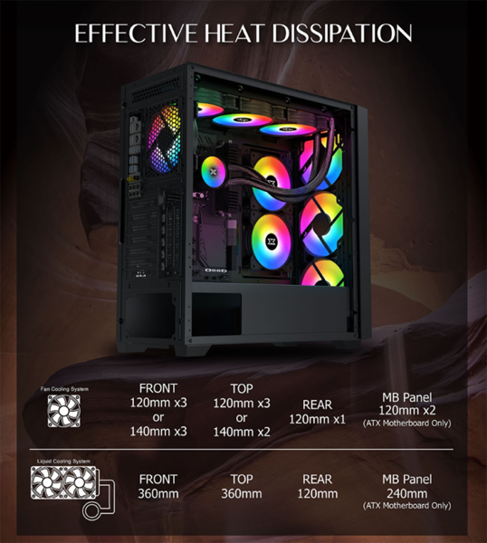| Hỗ trợ quạt | Top: 120mm x 3 hoặc 140mm x 2 Front: 120mm x 3 hoặc 140mm x 3 Rear: 120 mm x MB Panel: 120mm x 2 (Chỉ hỗ trợ ATX) |