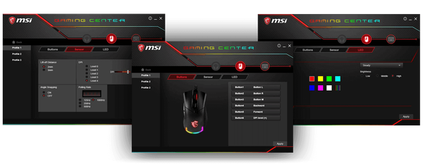 Tất cả các cài đặt chi tiết như điều khiển ánh sáng, gán nút, cài đặt DPI và ghi macro có thể được thực hiện trong phần mềm Gaming Center của MSI hoặc phần mềm Mystic Light.