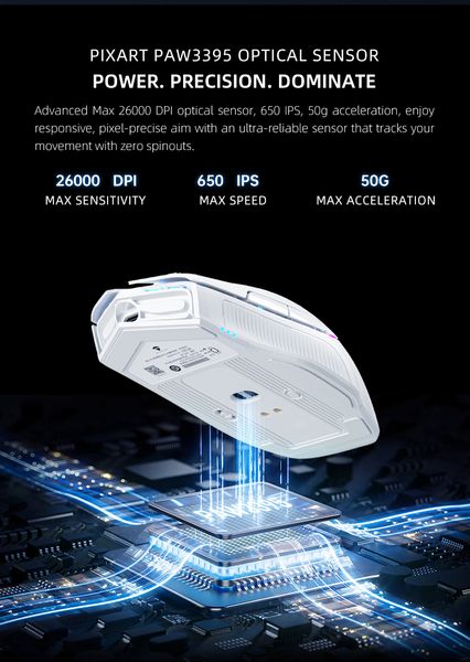 | Thông tin nổi bật: | Phương thức kết nối: Có dây/2.4G Wireless/Bluetooth 5.0 Kích thước: 122*72*39mm - Trọng lượng 83g±2g Cảm biến: PAW 3395 + Realtek RTL8763ESE DPI: 800(Red) - 1600(Green) - 2400(Blue-Default value) - 3200(Yellow) - 6400(Pink) - 26000(Orange) Polling rate 2000Hz Gia tốc chịu lực tối đa: 650IPS Gia tốc tối đa: 50g RGB lighting effect Sử dụng Switch Kailh GM8.0 tuổi nút trái phải lên tới 80 triệu lần Dung lượng PIN Lithium: 380mAh Tương thích: PC/Laptop/MacOS |