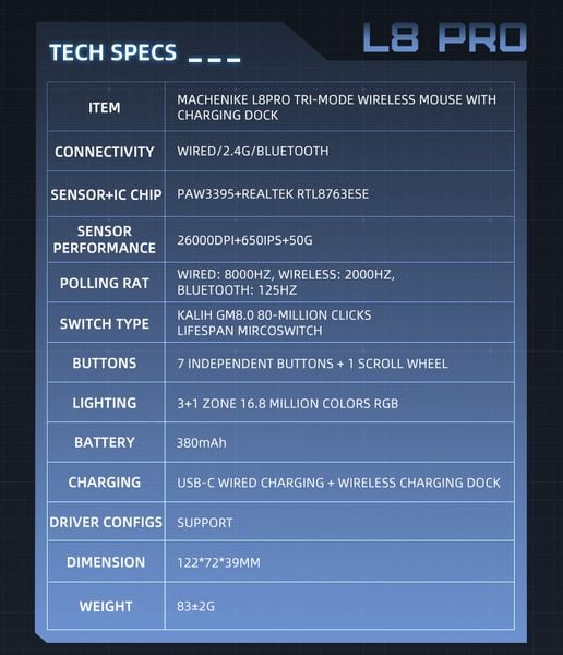 | Tên sản phẩm: | Chuột Mouse Machenike L8 Pro Dual-mode 2K |