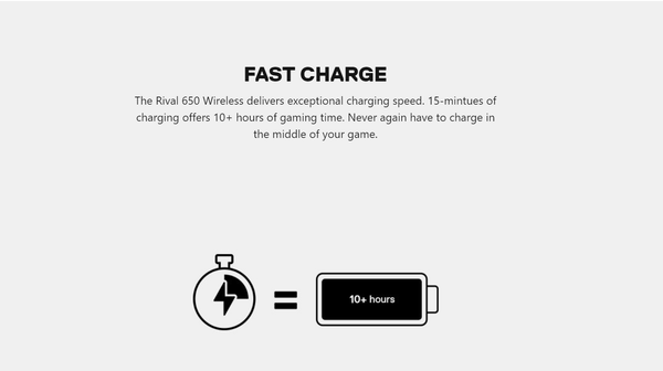 Công nghệ sạc nhanh của Steelseries cho thời gian sử dụng hơn 10 giờ chỉ sau 15 phút sạc.