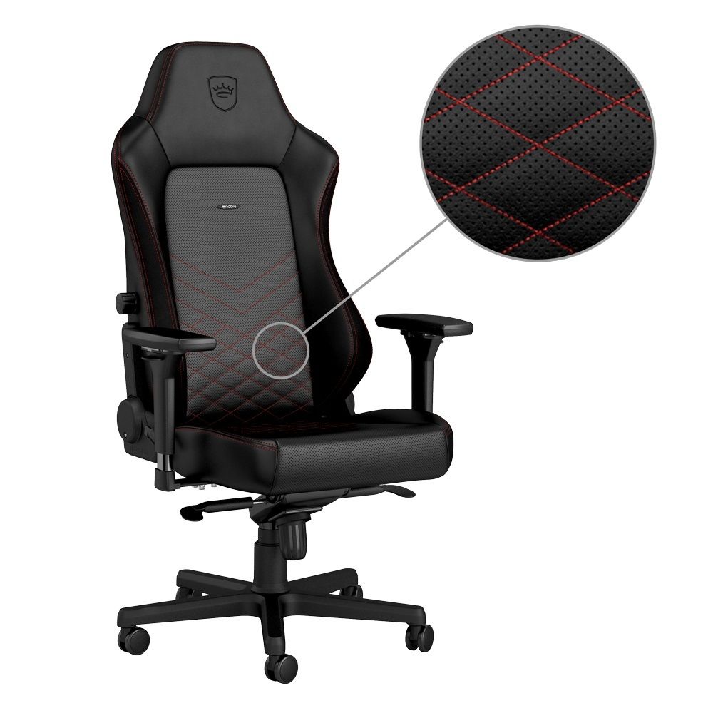 NobleChair Hero Series sở hữu lớp da PU bọc cao cấp, với những đường nhung chạy theo chân ghế giúp tăng thêm sự sang trọng, cao cấp cũng như thêm sự phong phú cho các mảng màu trên ghế. Việc sử dụng da PU cao cấp giúp người dùng dễ làm sạch, kháng nước cũng như thoáng khí hơn