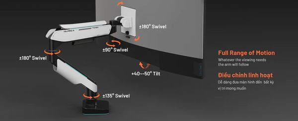 Đóng vai trò như một người hỗ trợ linh hoạt, giá đỡ màn hình Human Motion T9 Pro II nổi bật với khả năng xoay đa chiều, cho phép người dùng tùy chỉnh góc nhìn theo ý muốn. Việc này góp phần đảm bảo việc sử dụng máy tính kéo dài không gây ra tình trạng mỏi mắt hay đau lưng.
