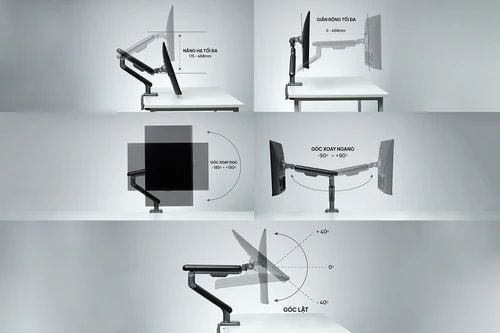 Độ xoay đa hướng (xoay ngang 180 độ) hỗ trợ di chuyển chỗ ngồi sang đối diện một cách thuận tiện. Góc điều chỉnh xoay dọc (360 độ) cho phép chuyển từ màn hình ngang sang dọc. Người dùng còn có thể điều chỉnh độ cao màn hình, nâng lên hạ xuống tuỳ ý, phù hợp cho việc sử dụng màn hình khi đứng hoặc ngồi.