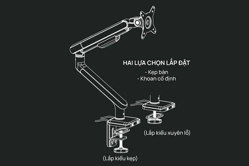 Giá đỡ màn hình HyperWork A1C thể hiện sự tiện lợi trong quá trình lắp đặt, đồng thời nâng tầm thẩm mỹ cho không gian làm việc. Sản phẩm cho phép lựa chọn giữa hai phương thức lắp đặt: kẹp bàn và lắp đặt kiểu xuyên lỗ trên mặt bàn, mang đến sự linh hoạt tối đa.