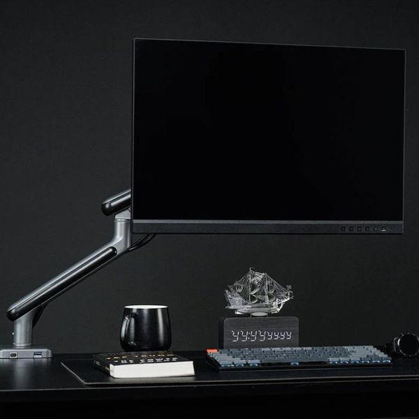 HyperWork A1C được thiết kế theo phong cách tối giản với màu xám và đen, tăng thêm vẻ sang trọng và hiện đại. Giá đỡ bao gồm ba trục, cho phép xoay gập linh hoạt.
