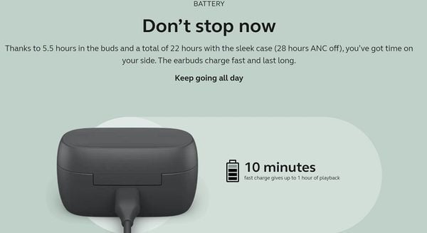 Jabra Elite 4 có thời lượng pin ấn tượng. Khi tắt ANC, bạn có thể nghe nhạc liên tục trong 7 giờ chỉ với một lần sạc. Nếu kết hợp với hộp sạc, thời gian sử dụng có thể kéo dài tới 28 giờ.