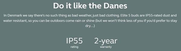 Không thể phủ nhận rằng khi nhắc tới tai nghe không dây từ Đan Mạch, Jabra đứng trong hàng đầu những thương hiệu được tin tưởng và yêu thích. Jabra Elite 5, mẫu tai nghe không dây thể thao mới nhất với chống ồn chủ động, tiếp tục truyền thống về thiết kế công thái học đặc trưng. Với việc phân tích hàng chục ngàn hình dáng tai người, Jabra đã tạo ra một housing gọn gàng, vừa vặn với tai của hầu hết khách hàng. Trọng lượng chỉ 5g mỗi bên, không gây khó chịu khi đeo trong thời gian dài.