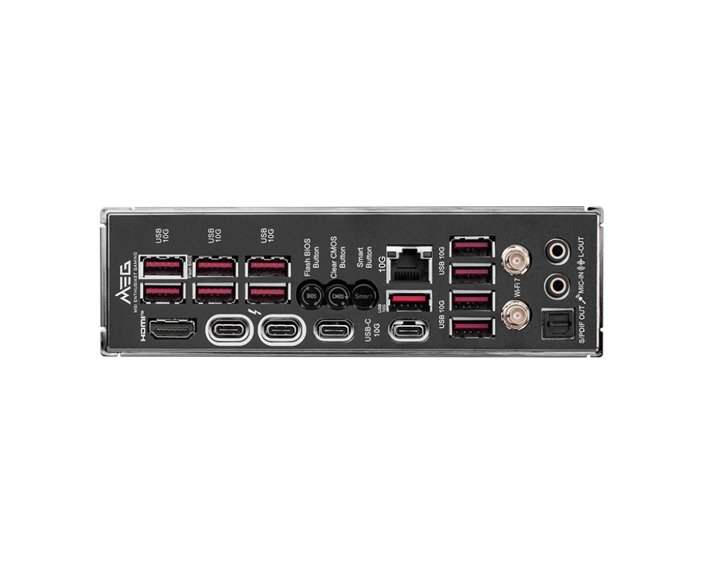 BACK PANEL PORTS | USB 10Gbps (Type-A) Flash BIOS Button Clear CMOS Button Smart Button 10G LAN Wi-Fi / Bluetooth HD Audio Connectors HDMI™ 2.1 Port Thunderbolt™ 4 40Gbps (Type-C) USB 10Gbps (Type-C) USB 10Gbps (Type-A) Optical S/PDIF-Out |
