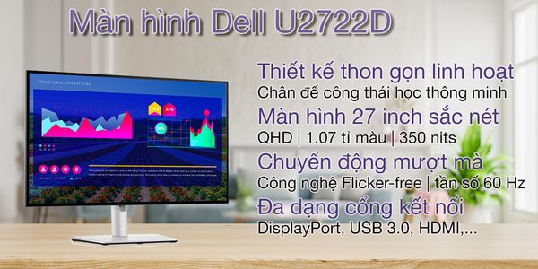 Màn hình Dell U2722D (27"/QHD/IPS/60Hz) là một sản phẩm đáng chú ý trong dòng sản phẩm màn hình Dell. Với kích thước 27 inch, độ phân giải QHD (2560x1440 pixel) và công nghệ IPS, sản phẩm này đáp ứng nhu cầu sử dụng của nhiều người dùng, từ công việc đến giải trí. Màn hình Dell U2722D có tần số làm mới 60Hz, giúp tránh tình trạng nhòe hình và cung cấp hiệu ứng chuyển động mượt mà. Điều này quan trọng đối với những người dùng yêu thích chơi game hoặc xem video động.